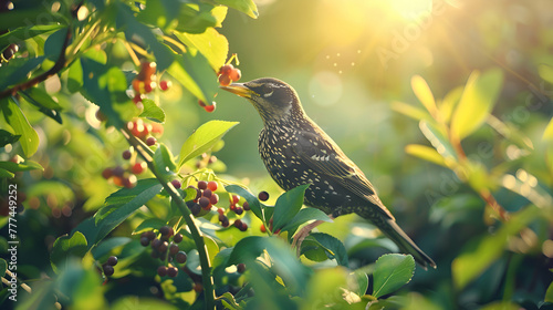 A close-up of a starling delicately plucking a berry from a lush bush, with vibrant green foliage and dappled sunlight casting shadows in the background