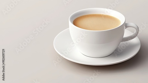 A close-up of a steaming cup of coffee in a simple white ceramic mug, resting on a matching saucer against a minimalist background.