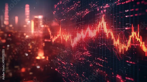A close-up of a stock market screen showing a red, declining graph, representing a market crash or financial downturn. Perfect for finance and economic visuals.