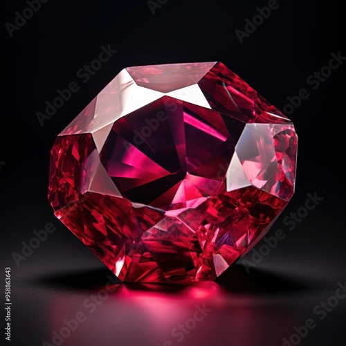 A closeup of a striking red ruby diamond on a black surface backgroung. the gemstone shimmers