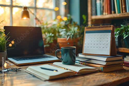 A close-up of a student's desk featuring neatly arranged school supplies, an open September calendar, a coffee cup, books, and a laptop.