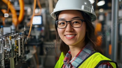 A close-up of a technician wearing a hard hat and reflective vest, smiling in an industrial setting with electronic manufacturing equipment