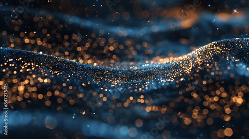 a close-up of a textured surface with blue and golden hues. There are scattered golden particles that resemble glitter, creating a sparkling effect against the dark background