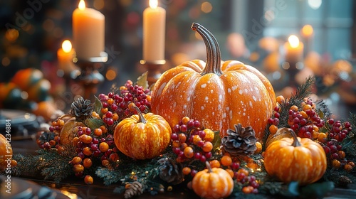 A close-up of a Thanksgiving table with decorative gourds and pumpkins