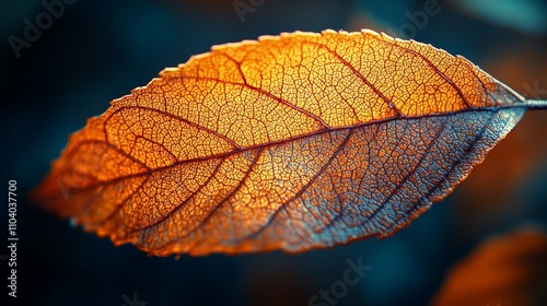 A close-up of a translucent leaf showcasing intricate vein patterns and warm colors.