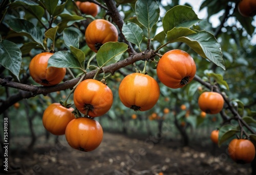 A close-up of a tree branch bearing persimmon fruits in a plantation, showcasing nature's bounty by ai generated
