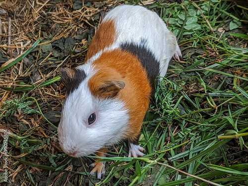 A close-up of a tricolor guinea pig with white, black, and orange fur. The guinea pig is sitting on a bed of green grass and hay.