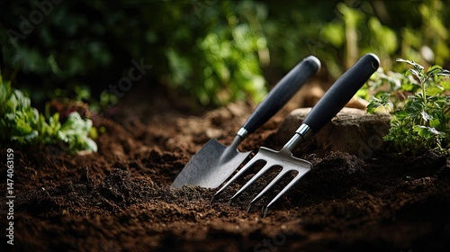 A close-up of a trowel and hand rake on moist, fertile soil in a garden, with the texture of the earth suggesting it's ready for planting
