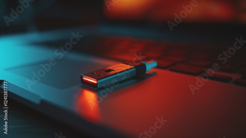 A close-up of a USB flash drive plugged into a laptop, with soft ambient light highlighting its sleek metal design and the glow from the laptop screen.