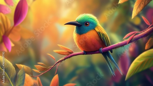 A close-up of a vibrant, exotic bird perched on a colorful branch in a jungle.