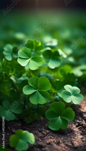 A close-up of a vibrant green four-leaf clover standing tall amidst a blurred green background. The leaves are glossy and well-defined, capturing the sunlight beautifully.