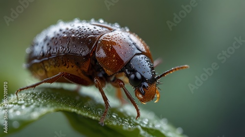 A close-up of a wet brown beetle with dew drops on its body, standing on a green leaf.