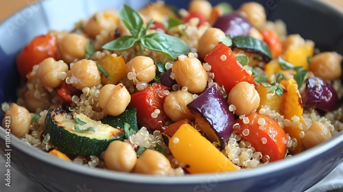 A close-up of a whole grain quinoa bowl topped with roasted vegetables and chickpeas, emphasizing a plant-based diet