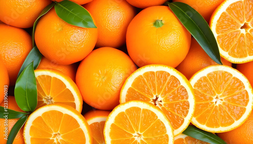 A close-up of a whole orange with two juicy slices arranged beside it. The image captures the rich, natural texture of the orange peel and the vibrant, translucent flesh of the slices. Green leaves ad