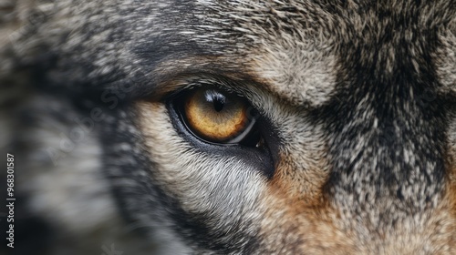 A close-up of a wolf eye, showing the detail of the iris and the intense gaze of the animal.