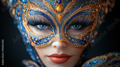 A close-up of a woman in an ornate, colorful masquerade mask with striking makeup.