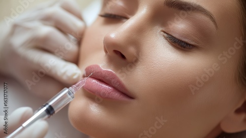 A close-up of a woman receiving a cosmetic lip injection, highlighting the procedure and her serene expression.