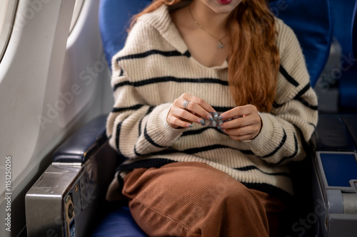 A close-up of a woman taking an airsick pill at her seat before the flight takes off.