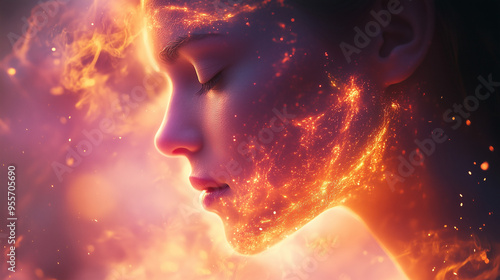 A close-up of a woman's face illuminated by fiery sparks, capturing a moment of intense focus and inner strength