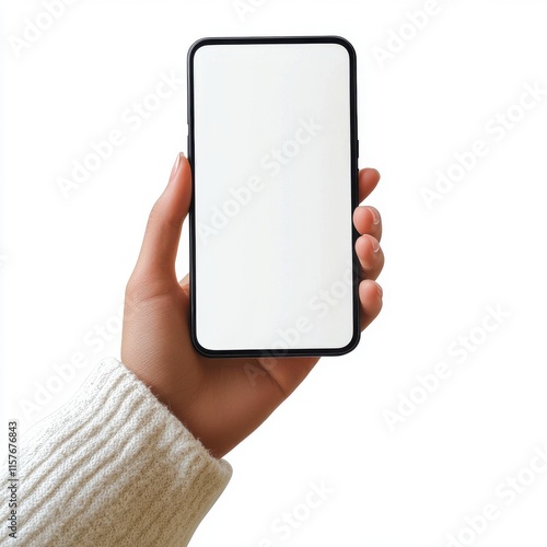 A close-up of a woman's hand holding a modern smartphone with a blank screen, dressed in a cozy sweater.
