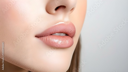 A close-up of a woman's lips with a natural, glossy finish and smooth skin, focusing on the contours and colors. Concept Close-Up Details, Natural Glossy Finish, Smooth Skin Texture