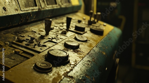 A close-up of a worn control panel with levers and buttons, suggesting industrial use.