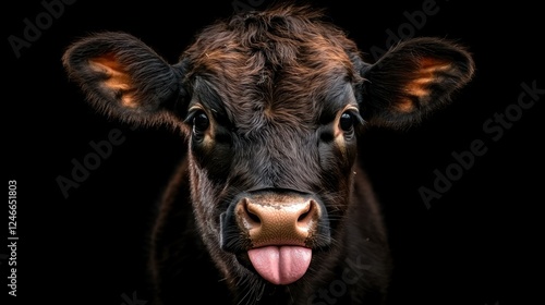 A close-up of a young black calf with a curious expression, sticking out its tongue against a dark background.