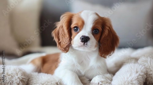 A close-up of an adorable puppy with big, expressive eyes and a playful expression, sitting on a fluffy blanket in a cozy living room setting.