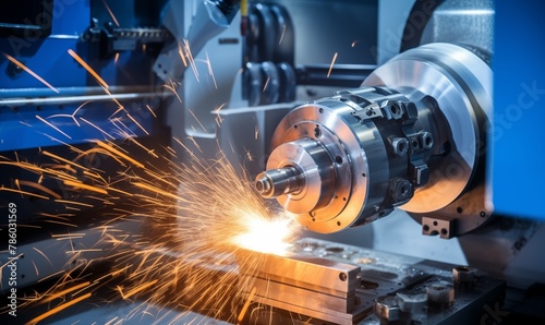 A closeup of an aluminum spool turning on the lathe, with sparks flying around it in blue and white tones. The background is dark and blurred, creating depth.