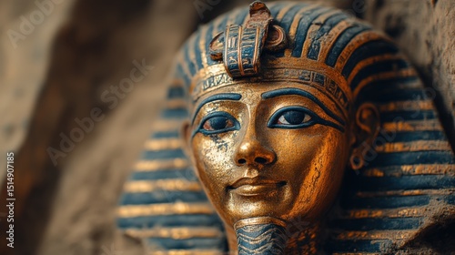 A close-up of an ancient Egyptian pharaoh"s golden mask with intricate blue and gold details.