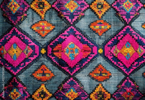 A close-up of an antique rug, featuring geometric patterns in vibrant colors like blue and red.