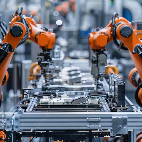 A closeup of an automatic assembly line robot arm placing components, highlighting precision in modern manufacturing