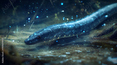 A close-up of an electric eel in murky water, its long body undulating through the current, with faint blue electric sparks illuminating the water around it