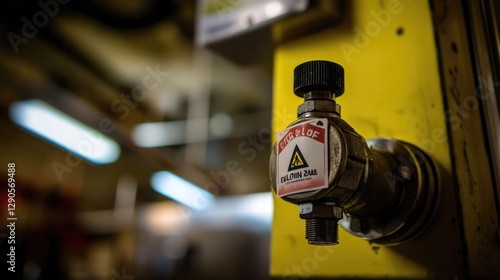 A close-up of an emergency shut-off valve with warning labels on a yellow backdrop