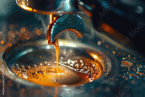 A close-up of an espresso shot pulling through a portafilter, showcasing the crema formation