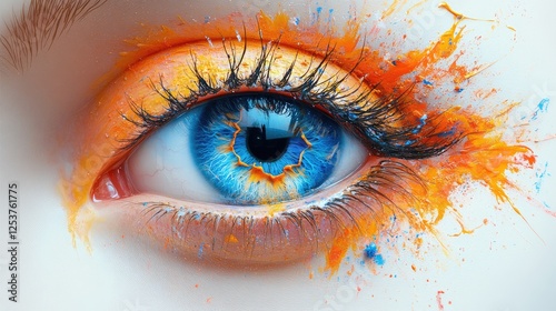 A close-up of an eye with vibrant orange and blue paint splashes around it.