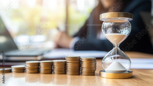A close-up of an hourglass beside stacked coins, symbolizing the relationship between time and money in a business or financial context.