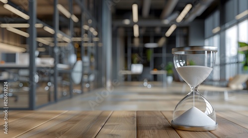 A closeup of an hourglass on a desk in the foreground, set against a blurred background of a modern office space with glass walls and wooden flooring.