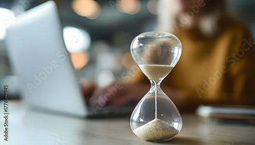 A close-up of an hourglass on a desk symbolizing time management while someone works on a laptop.