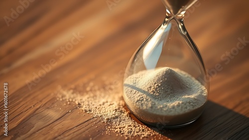 A close-up of an hourglass with flowing sand on wood, symbolizing the passage of time with warm lighting.