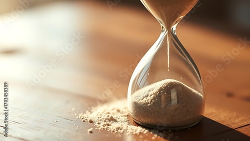 A close-up of an hourglass with flowing sand on wood, symbolizing the passage of time with warm lighting.