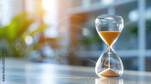 A close-up of an hourglass with golden sand, symbolizing the passage of time, set against a softly blurred background of greenery and light.