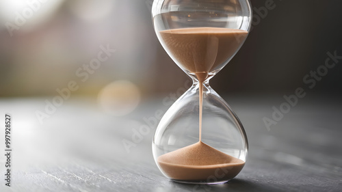 A close-up of an hourglass with the sand softly flowing, symbolizing the passage of time and the value of life's moments. (indicates World Day of Older Persons).