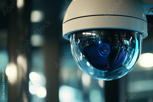 A close-up of an indoor CCTV camera with a white dome cover and blue glass lens on a blurred background in a shopping mall or business office interior, a commercial security concept