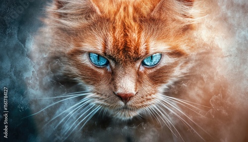 A close-up of an intense-looking orange cat with striking blue eyes amidst a smoky background.