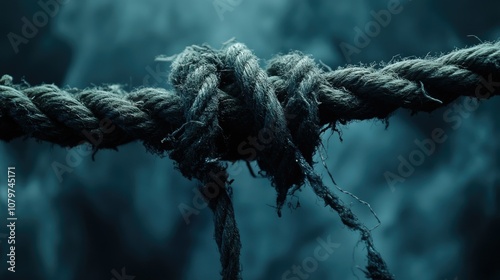 A close-up of an old, frayed rope with strands coming apart, set against a moody dark background for a weathered, industrial aesthetic
