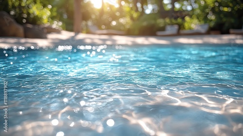 A close-up of an outdoor swimming pool, with sparkling water and light sand along the edges