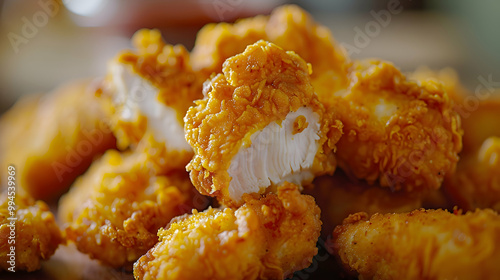 A close-up of chicken tenders with a golden crust, captured using an ultra HD camera with a ring light for even illumination