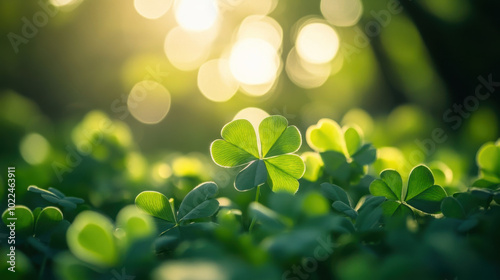 A close-up of clover leaves with a background of blurred greenery and sunlight creating a dreamy effect