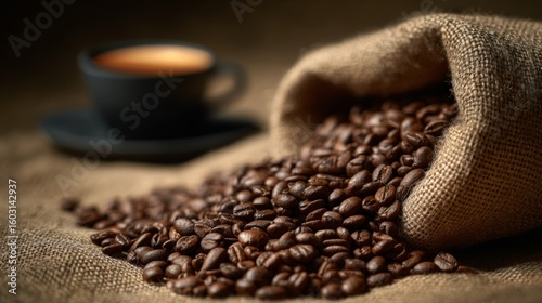 A close-up of coffee beans spilling from a burlap sack, with a cup of brewed coffee in the background, rich textures and warm tones.